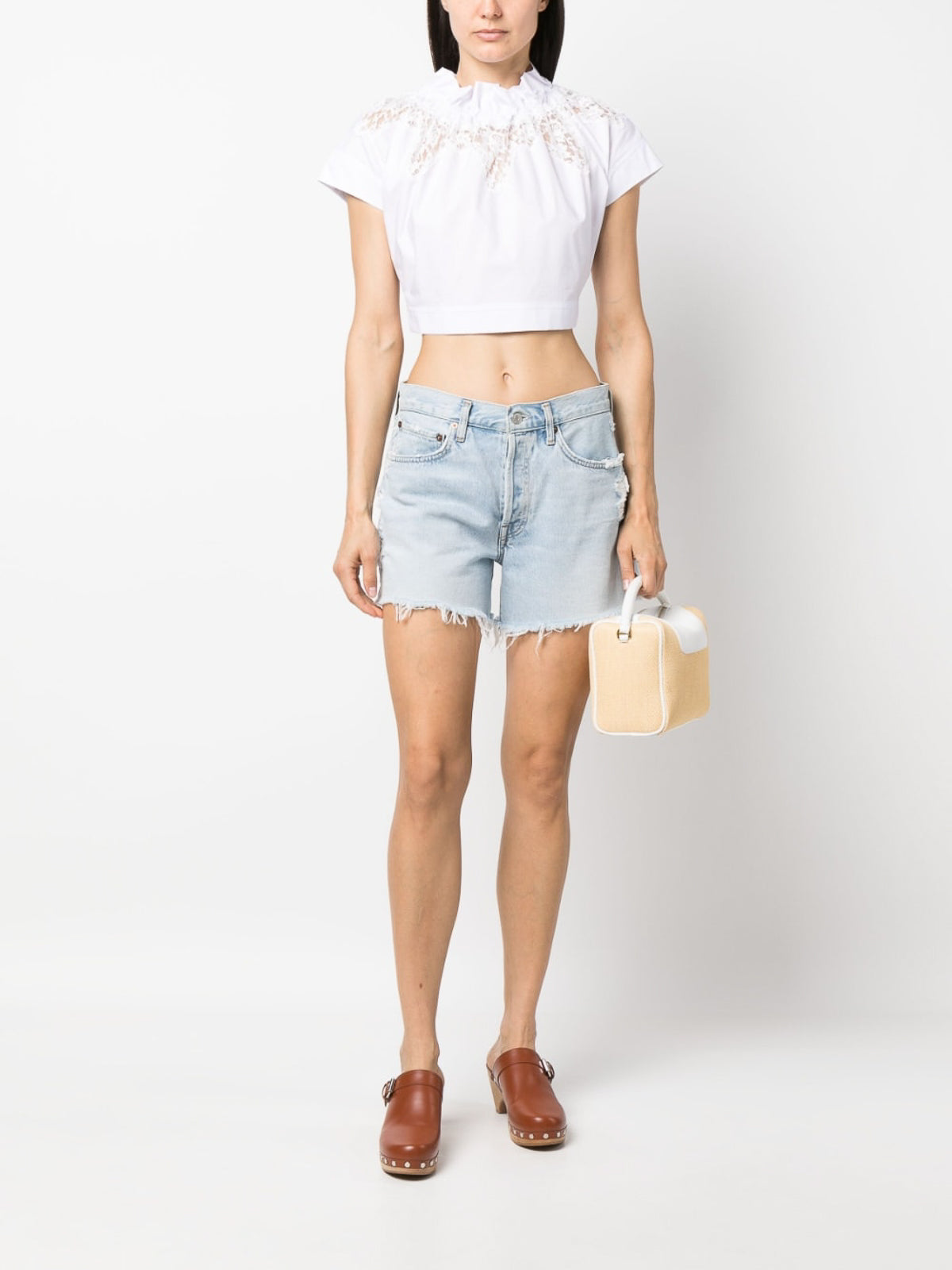 Style: Cropped length, cap sleeves, gathered neckline, lace-panel detailing, rear tie and zip fastening
