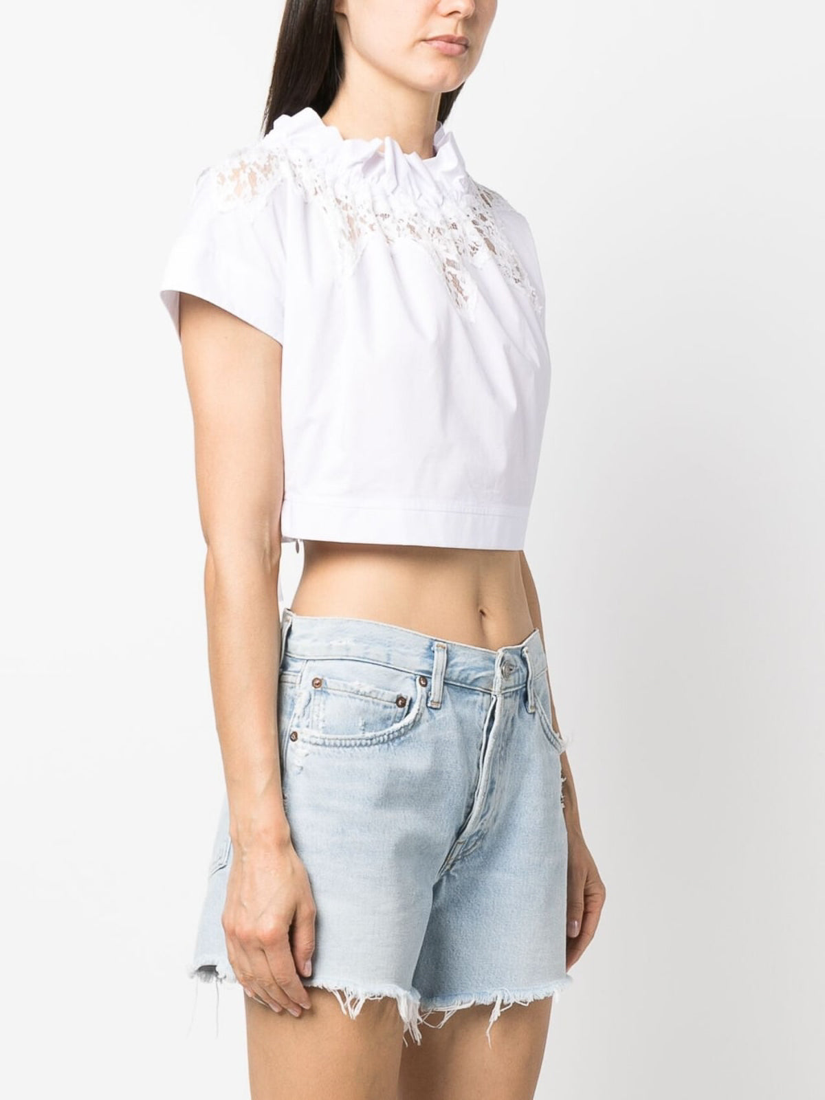 Elevate your wardrobe with the Ermanno Scervino Lace-Detail Cotton Top — a refined and feminine staple that combines Italian craftsmanship with delicate textural details. Crafted from 100% cotton, this cropped silhouette features white floral lace panels overlaid on the body, a gathered neckline, cap sleeves, and a rear tie fastening with an optional zip closure for a polished finish. The clean straight hem and softly draped fit make it ideal for both smart-casual and elevated daywear.