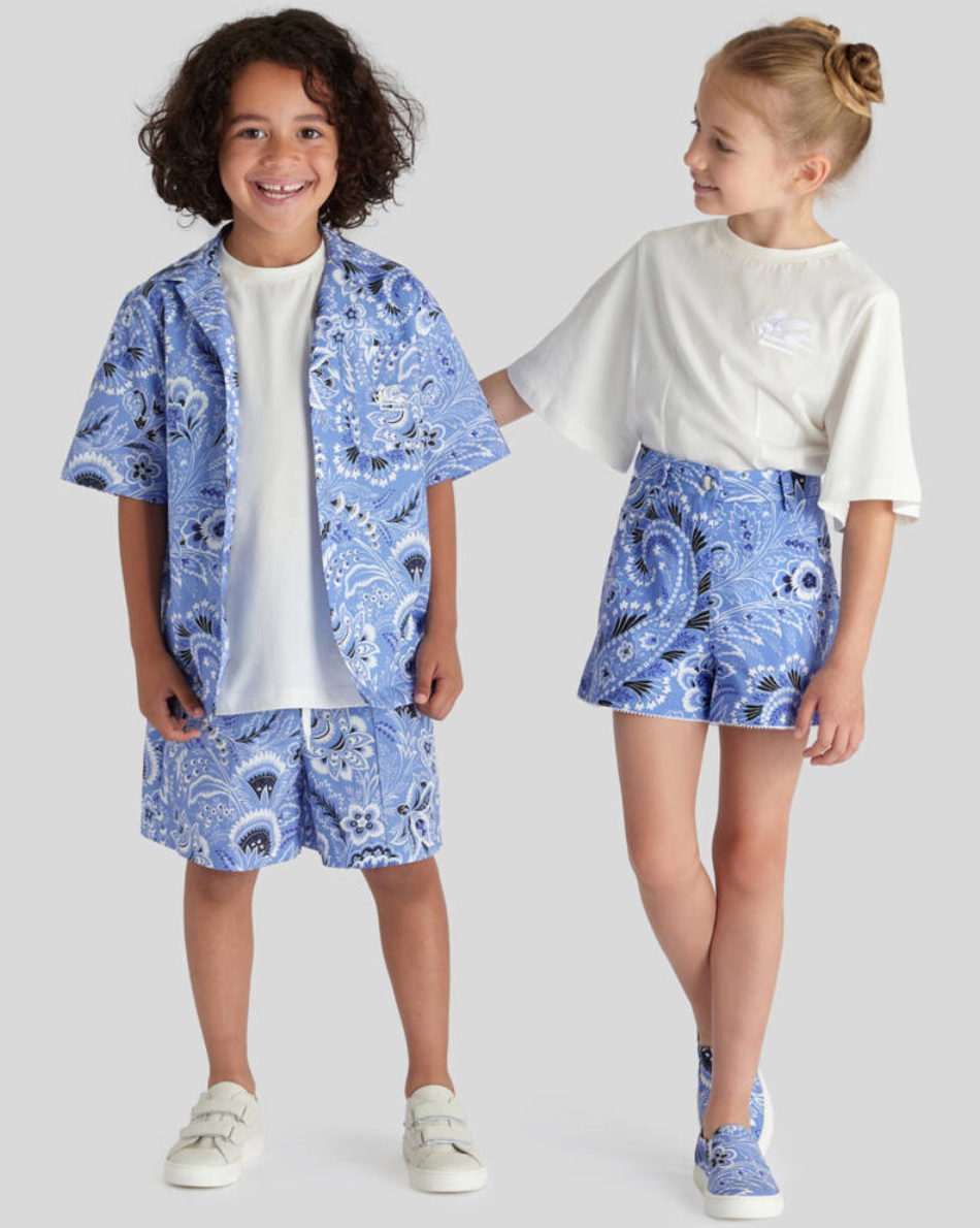 This Etro shirt for boys wraps classic Italian craftsmanship in a vibrant floral-paisley print, delivering a refined yet playful style perfect for summer days. Made from lightweight, soft cotton poplin, it offers breathable comfort and ease — ideal for warm-weather vacations, seaside strolls or stylish family outings. The intricate paisley-floral pattern and subtle embroidered logo detail add signature luxury charm, making it a standout item in any kids’ wardrobe.