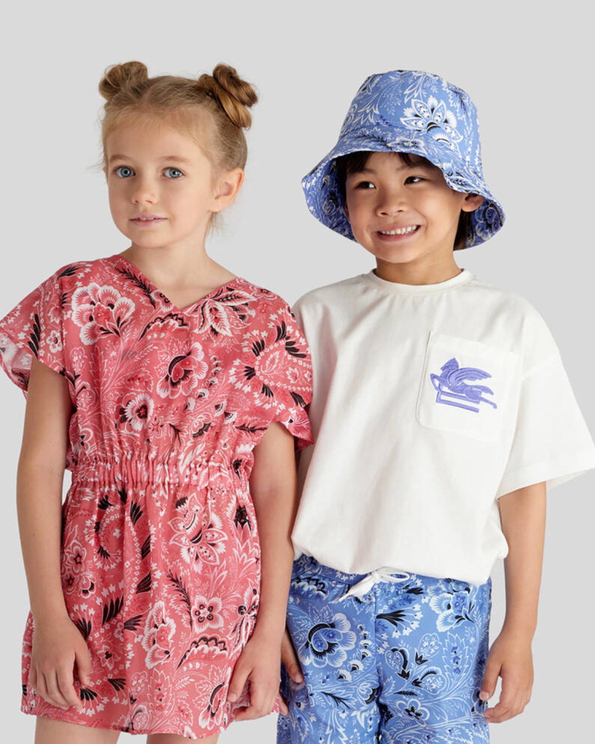 A stylish cotton bucket hat from Etro, featuring a vivid floral-paisley print in blue, white and black — perfect for sunny days at the beach, resort escapes or casual summer outfits. The soft, lightweight poplin construction ensures comfort and breathability, while the boho-chic pattern adds elegant, playful character to any look. Easy to pair with swimwear or summer streetwear, this hat brings refined Italian craftsmanship to everyday warm-weather style.