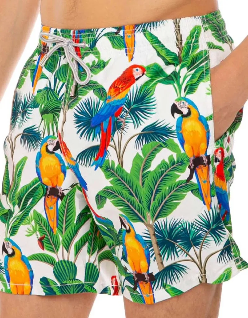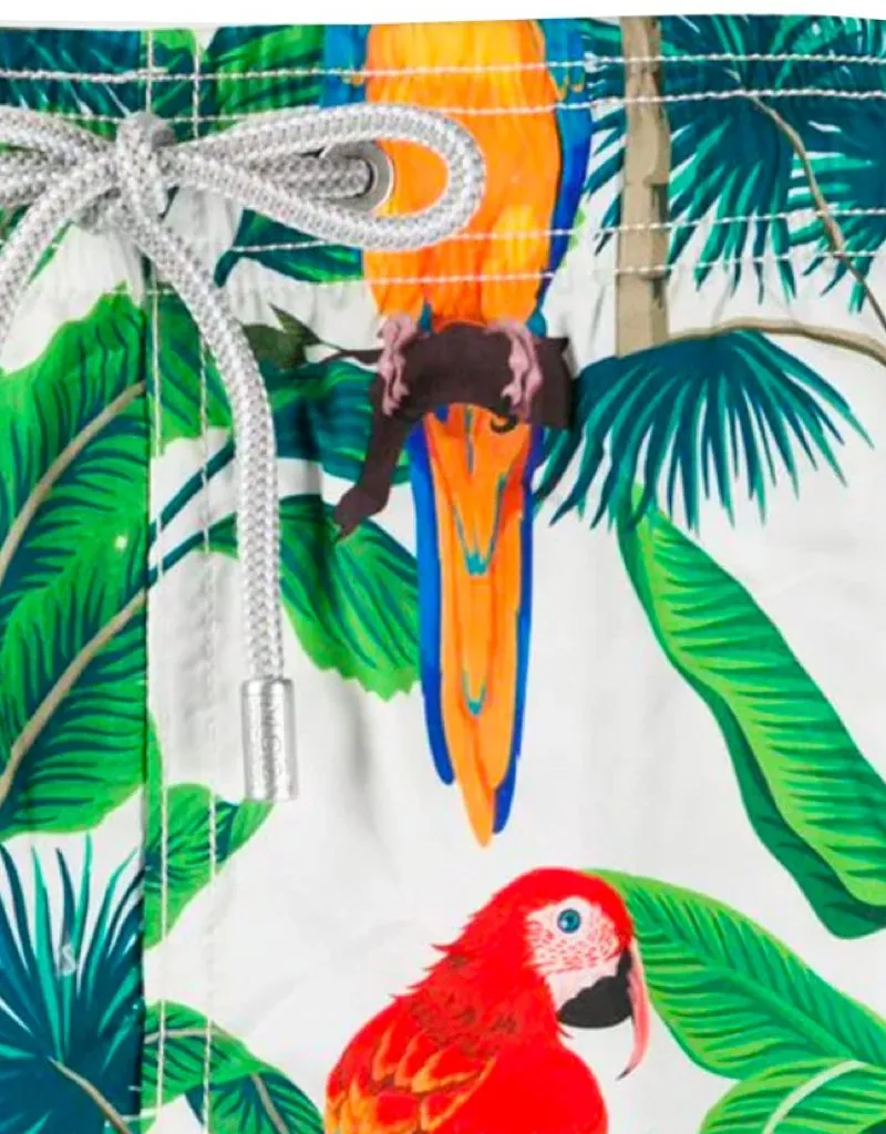MC2 GUSTAVIA Parrot Shorts,This vibrant one-piece swimsuit by MC2 Saint Barth showcases an all-over parrot print, blending tropical flair with refined design. The sleek silhouette flatters the figure while the lightweight fabric offers comfortable wear under the sun. Ideal for luxury beach resorts or poolside lounging, it brings bold colour and statement style to your swim wardrobe.