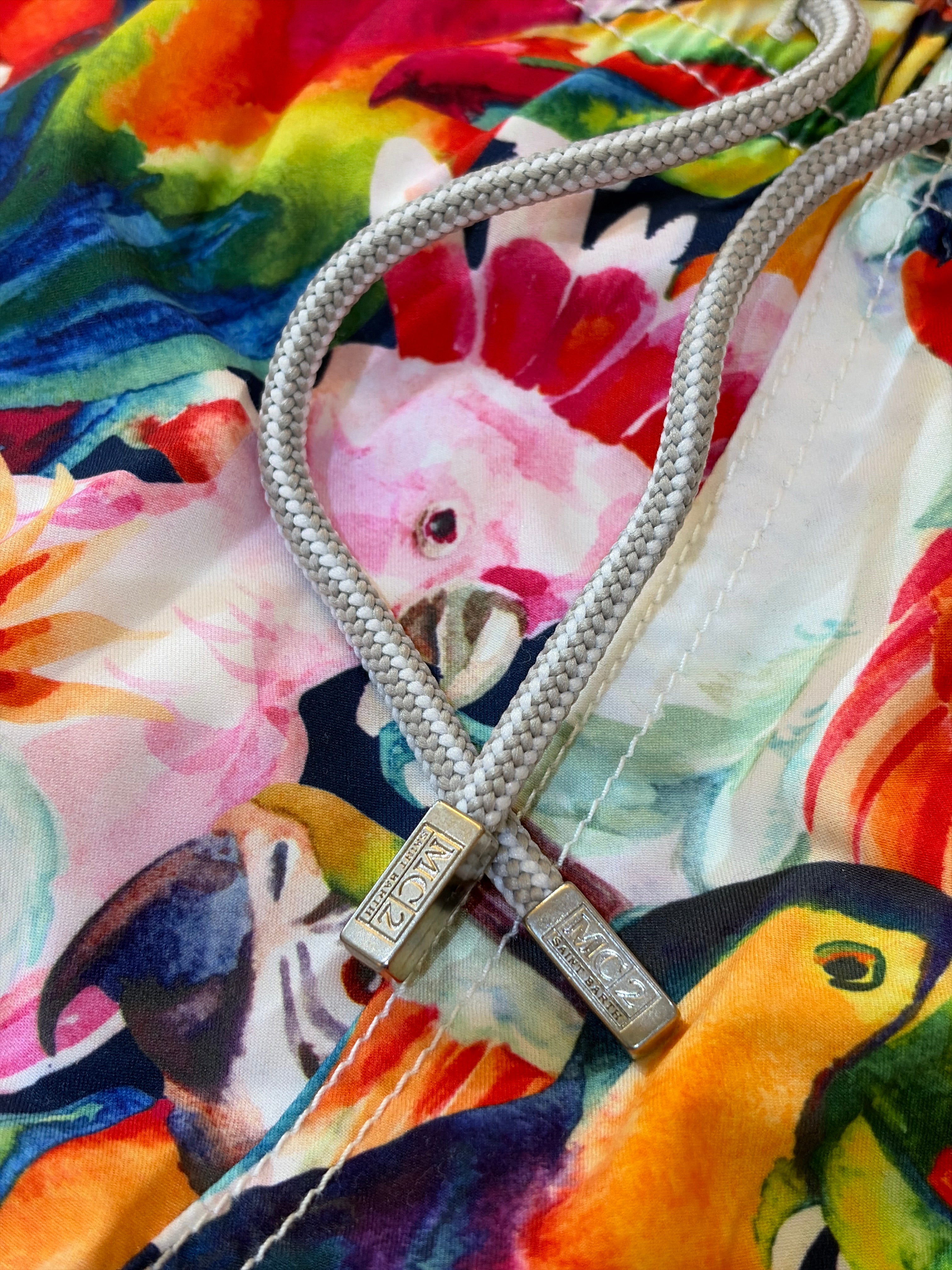 A pair of mid-length swim shorts by MC2 Saint Barth in bold tropical print — vibrant foliage and parrot motifs dance across quick-dry fabric, delivering resort-ready luxury with comfort and flare. Elasticated waistband with drawcord ensures a perfect fit, and side pockets add practical elegance for beach or poolside wear.