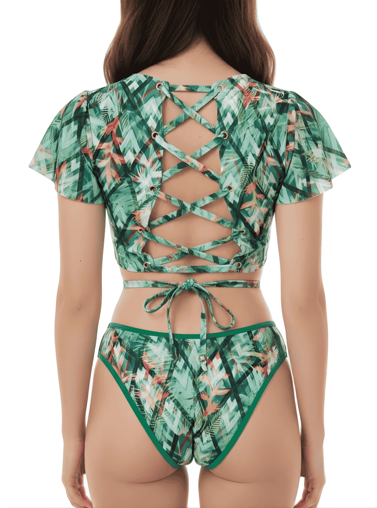 - Bikini top with short sleeves, lacing on the back, no cups, but if desired, they can be sewn